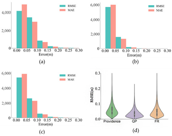 Root-mean-square error (RMSE) and mean absolute error (MAE) of the residual water level prediction (n = 3) in the testing set at (a) Providence, (b) Quonset Point (QP), and (c) Fall River (FR); (d) density of RMSE at each station.