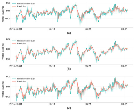 In addition to the simulation deviation, the spatial backgrounds of other constituents were not clear, so IDW was still used for spatial correction. To better illustrate the sources of error in the water level forecasting, Figure 9 shows a time series of the astronomical tides and residual water level at different lead times at CL. The astronomical tides prediction was highly correlated with the actual values, indicating that the stationary constituent was well predicted and corrected (Figure 9a). The prediction of the residual water level was closely associated with the lead times (n). When n was equal to 1, the error was essentially distributed around zero (Figure 9b), and when n was equal to 3, the errors oscillated slightly (Figure 9c). The above results demonstrate that the accuracy of the water level forecasting at CL depends mainly on the accuracy of the residual water level forecasting at observation stations.