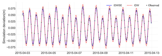 As the main constituent in the simulation deviation, the amplitude of M2 at Providence and FR is greater than that at QP, which causes weight anomalies when using 3PM interpolation. According to Table 7, the weights calculated using IDW and IDWSE have different biases. The performance of the two interpolation methods is shown in Figure 8. The curves show that the value at CL is amplified using IDW interpolation, while IDWSE interpolation solves this problem by increasing the weak weighting (QP). Furthermore, the interpolation accuracy is less sensitive to the interpolation method, which may be due to highly correlated components within the region. Despite this, IDWSE still improves the IDW interpolation accuracy slightly and proves its effectiveness.