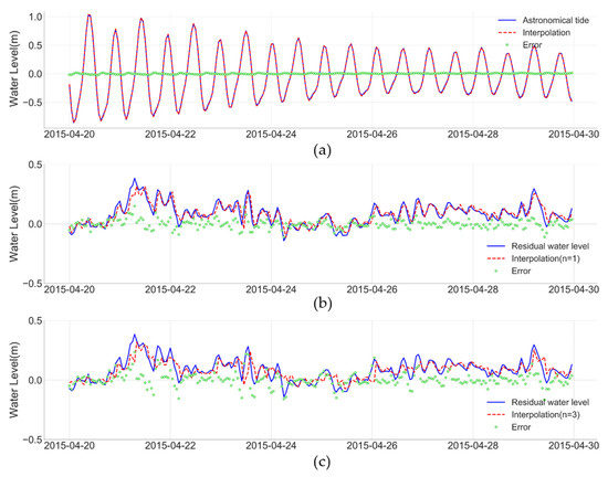 Predictions of (a) astronomical tide, (b) residual water level (n = 1), and (c) residual water level (n = 3) at CL, obtained by interpolation from Providence, FR, and QP.