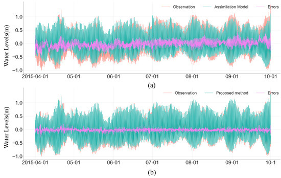 Time series of the observed water level at CL compared with (a) the assimilation model and (b) the proposed method (n = 3).