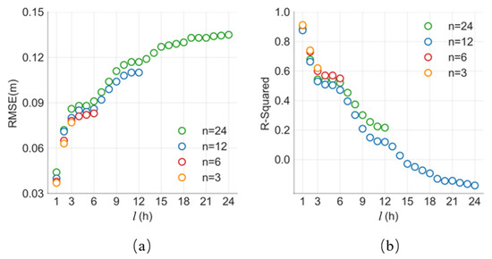 As described previously, the residual water level is the primary component of prediction error. Thus, it is necessary to analyze the relationship between the lead time and accuracy in the LSTM network. Considering the moderate efficacy of the prediction performance at FR, we predicted the hourly residual water level at FR for 3, 6, 12, and 24 h lead time. The RMSE and R2 of the prediction are illustrated in Figure 11. With increasing lead times, the overall performance of LSTM decreased slightly. Based on observations of the lth forecast time in each group, the RMSE entered the first significant growth interval with an increase of approximately 5 cm. Subsequently, the RMSE was basically unchanged when the stationary interval was 3 < l ≤ 6. The RMSE then entered a second significant growth interval at 6 < l ≤ 9, with an increase of approximately 3.5 cm. Thereafter, the RMSE increased slowly and remained near 13 cm, indicating that the prediction gradually converges. Using another precision index (R2), its prediction was highly reliable (0.91) at the first forecast time. When l = 6, the predictions could still explain over 50% of the variation in the residual water level. Of note, R2 became negative when l = 15, indicating a failure of the LSTM network.