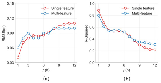 Figure 12 shows the forecast performance of these two models with a lead time of 12 h at FR. According to the variation in the RMSE and R2 curves, the interval l can be roughly divided into three parts: 0–3, 4–8, and 9–12 h. During the first interval [0, 3 h], meteorological features have a negative effect on the forecast. The RMSE of the MFFM at l = 1 reaches 6 cm, which is significantly larger than that of SFFM. During the second interval [4, 8 h], the forecast performance of these two models is almost equal. An interesting phenomenon is that the RMSE curve of MFFM does not continue to rise, but a “dent” occurs when l = 4 and 5. During the third interval [9, 12 h], the R2 of the MFFM is greater than that of SFFM by approximately 0.1, indicating that the meteorological features improve the performance of the MFFM during this period.