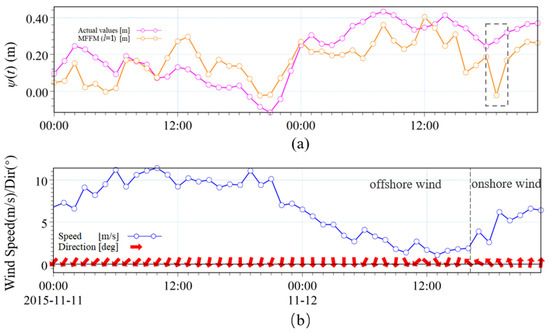 We took the predicted value of l = 1 as a sequence and then used Equation (18) to obtain the 2 days’ ψ(t) of MFFM at FR (Figure 13a). As a reference, we also provided the wind speed and direction, as shown in Figure 13b. The contrasts showed that MFFM could sometimes not accurately predict the direction and magnitude of the water level variability (within the dashed frame). In fact, due to the gravity and inertia, the water level is constantly changing to maintain a dynamic balance of the regional energy. Thus, it is difficult to fully characterize this process only by using wind features, and the accuracy of the MFFM is limited to a moderate level.