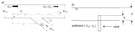 Vane-fields were first investigated by Odgaard and Kennedy [7], in 1983, to protect the outer bank of curved channels. Since then, vane-fields have been shown to potentially reduce the entrainment of bed sediments from alluvial channels into diversions (Barkdoll et al. [6]). Many variables influence the vanes’ desilting performance. For rough subcritical flows, a given geometry of the diverging channels and a given configuration of the diversion entrance, those variables include (Figure 1) the diversion discharge ratio (Barkdoll et al. [6]; Herrero et al. [8]), , where is the diversion discharge and is the discharge in the main channel upstream, the diversion angle (Alomari et al. [9]), (angle between the banks forming the downstream diversion corner), the channels’ width ratio (Alomari et al. [9]), , being the width of the diversion channel and standing for the upstream main channel width and, according to Wang et al. [4], the properties of the bed sediments (the median diameter, , and the gradation coefficient, ), and the number of vanes, their alignment and disposal ( and b), longitudinal and transverse location relative to the lateral diversion (c and a, respectively) and height above the bed, h, relative to the water depth, d.