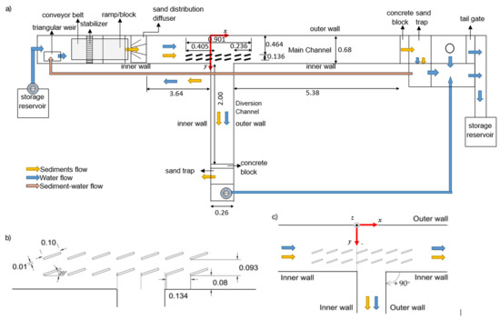 The origin of the coordinate system adopted in this study was defined at the main channel outer wall (Figure 2c and Figure 4) and the x axis was horizontal and aligned with the wall; the crosswise axis, y, was aligned with the upstream wall of the diversion. The vertical direction, z, was positive upward with its origin at 0.17 m above the main channel concrete bed.
