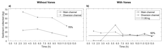 It became clear that, for NV, at equilibrium the major part of the sediment (76%) moved along the diversion (Figure 5a), i.e., at = 12 h. This result, corresponding to , contrasts with the findings of Herrero et al. [8], who reported a larger amount of sediment from the main channel than from the diversion as soon as . More importantly, the presence of vanes altered this behavior since both quantities became approximately equal, after 9 h, until equilibrium was reached at = 13:30 h (Figure 5b). Therefore, the presence of vanes caused a reduction of ≈26% in the amount of sand entering the diversion channel.