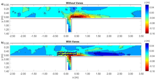 Minor bed level variations were registered upstream of the diversion as well as at m, for the case of NV (Figure 6a). For the VF case (Figure 6b), the more uniform bed zones were only found at m and at m. The greater differences between the two cases were observed at the entrance and close downstream of the diversion, where significant scour trenches were created in both cases in the main channel. Notice that similar trenches were observed by Barkdoll et al. [6], Herrero et al. [8] and Alomari et al. [9] in their experiments on diversions without vanes.