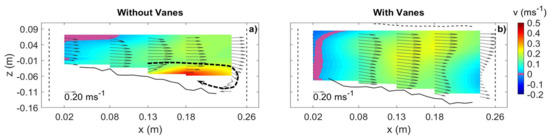 It became clear that the diversion vortex was formed near the bed in the absence of vanes (Figure 11a). This vortex was centered at m and aligned parallel to the longitudinal axis of the diversion, as observed and explained by Herrero et al. [8], who suggested that it continues into the diversion channel. No such vortex appeared in the VF case (Figure 11b), meaning that the vane-field inhibited its development, thus reducing the amount of sediment entering the diversion as, in the absence of vanes, this flow structure can drive a large amount of the main-channel bed load with the diverted water.