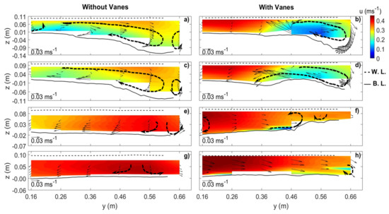 For the VF case, the u component was much higher from the main channel outer wall until its center than in the outer half channel, particularly below the top level of the vanes (Figure 12b,d). Above the vanes, the crosswise velocity was important at m (Figure 12b), where the deflected flow impinged on the inner wall and led to a clear downflow which seemed to develop into a vortical structure close to the bed, contributing to the scouring process, as in the NV case. This vortex added to the main channel vortical flow generated by the vanes (Figure 12b,d) downstream of the vane field, namely at m, where only one clear vortex was identified (Figure 12f).