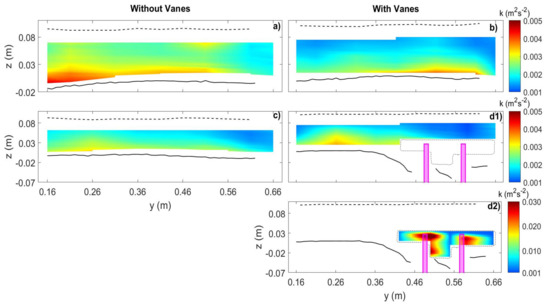 Turbulent kinetic energy k (m2·s−2) as color scale, in the NV and the VF experiments, in the main channel upstream of the diversion, at cross-sections: (a) m. (b) m. (c) m. (d1) m. (d2) m.