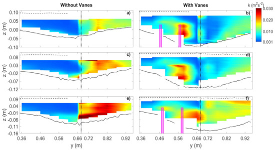 In the VF case, the zones of higher turbulent kinetic energy kept their link to the main channel vortex generated upstream. In the core of this vortex, at m (Figure 19b), the values of k were comparatively modest due to the tendency for flow stagnation along x (Figure 9b). This decrease was less evident at m (Figure 19d) as u slightly increased. The core of higher k values moved towards the centre of the channel at m (Figure 19f) due to the tendency to flow separation underneath the crosswise flow observed at the outer slope of the sand deposit created downstream of the vanes in the VF experiment (Figure 6b).