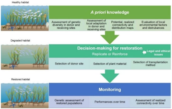 As we are approaching a new decade of ecosystem restoration [], the need to rebuild marine life for a sustainable future has become more urgent than ever before []. Here, we aimed to provide a comprehensive review about genetic issues to be considered to perform a successful re-establishment of populations and for recovering lost ecosystem functions. To this end, we first reviewed conceptual frameworks related to genetic components in restoration, with a particular emphasis on seagrasses. We then discussed different genetic-related aspects to be considered for restoring degraded environments, including the choice of whether replicate or reinforce the extant genetic structure, the importance of having genetic diversity and connectivity maps, the selection of donor sites as well as the monitoring efforts after transplantation. We also investigated the actual situation of legal and ethical issues dealing with seagrass restoration at a regional, national and international scale. Finally, we discussed novel approaches and future directions for seagrasses genetic research that could improve the success of restoration activities.