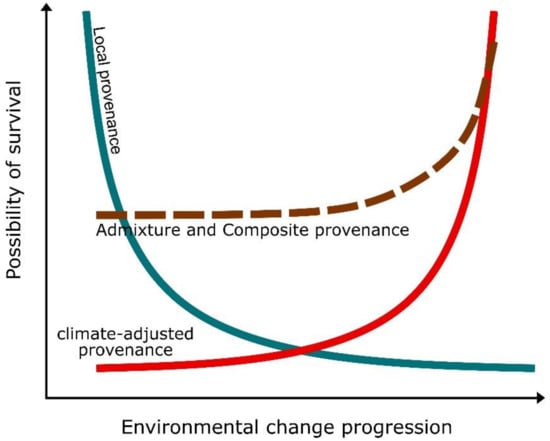 Graph showing the conceptual relationship between local (blue line), climate-adjusted (red line), admixture and composite (dashed line) provenance (sensu Prober et al. []) with the possibility of survival of the restored seagrasses under environmental change (e.g., ocean warming, eutrophication, etc.).