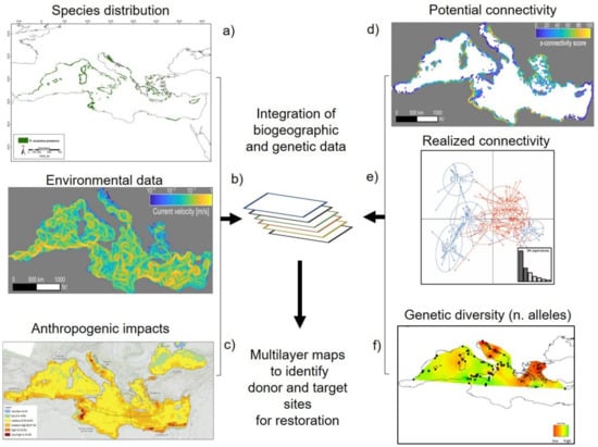 Examples of models and distributions maps and genetic data from seagrass’ studies of the Mediterranean Sea. The integration of species distribution (a []), environmental data (b []), anthropogenic impacts (c []), with potential (d []) and realized connectivity maps (e []) and genetic diversity analysis (f []) could be combined to develop multilayers maps for the identifications of donor and target sites in seagrass restoration (see text for more detail). The figure was modified from the studies cited above.