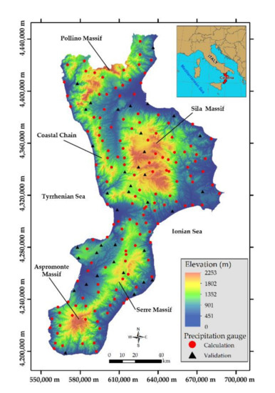 Calabria region is located at the southern part of the Italian peninsula (Figure 1) and has a surface area of 15,080 km2. The mean elevation is 597 m above sea level (a.s.l.), whereas its highest elevation is 2266 m a.s.l. Calabria region is one of the most mountainous Italian areas, but it does not have many high peaks (Figure 1): 42% of the regional area is classified as mountain (elevation greater than 500 m a.s.l.), 49% hills (elevation between 50 and 500 m a.s.l.), and only 9% plain (elevation less than 50 m a.s.l.).