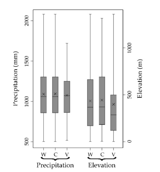 Box plots of the whole (W), calculation (C), and validation (V) sets for the mean annual precipitation and elevation data.