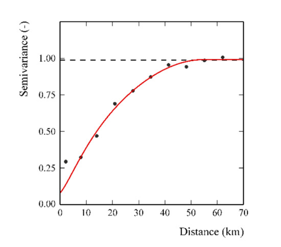 In the scope of identifying possible anisotropic behaviors, a map of the 2D variograms (not shown) of precipitation data was computed, but no relevant difference as a function of direction (anisotropy) was found. Therefore, an experimental variogram was computed and modelled by a bounded isotropic nested variogram model (Figure 4), which included three basic structures: a nugget effect, a K-Bessel model [20] with a scale (distance parameter) of about 29.8 km and a parameter equal to 1, and a spherical model [37] with range of 54.6 km.