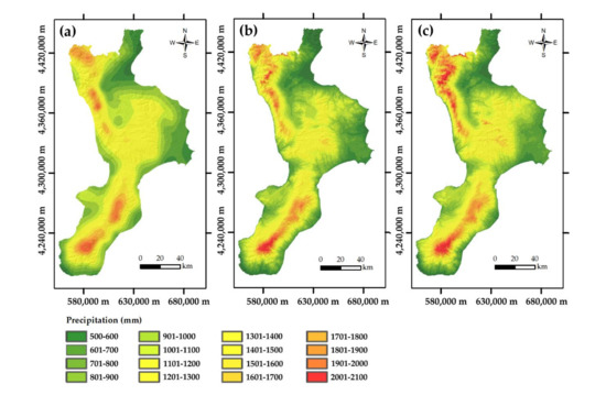 Calabria region, as a result of its geographic position within the Mediterranean sea and its orography (Figure 1), has a climate typically Mediterranean [35], with warm air currents coming from Africa and high temperatures affecting the Ionian side of Calabria, which leads to short and heavy precipitation. The Tyrrhenian side of Calabria is affected by western air current, which causes temperatures to be milder and precipitation amount to be higher on the mountains than on the Ionian side. The inner areas of the region have cold and snowy winters, and fresh summers with some precipitation [36].