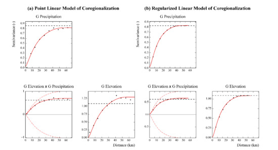 As explained before, elevation and precipitation data are associated with different support sizes, which for precipitation can be considered punctual, whereas for elevation it is equal to the resolution of the digital elevation model (80 m × 80 m). Taking this difference in support into account required the regularization of variograms (Figure 6). The regularized variograms differ from the point support variograms by a constant term that measures within-block variance and is related to the size and geometry of the support [40] (Figure 6). The block LMC (Figure 6b), compared to point LMC (Figure 6a), shows that as block size increases, the sills decrease whereas the ranges increase. The nugget should also decrease because the proportion of noise in the data decreases and the nugget should be filtered. However, in this particular case, there is little apparent decrease in the nugget because it was already very small in the point LMC.