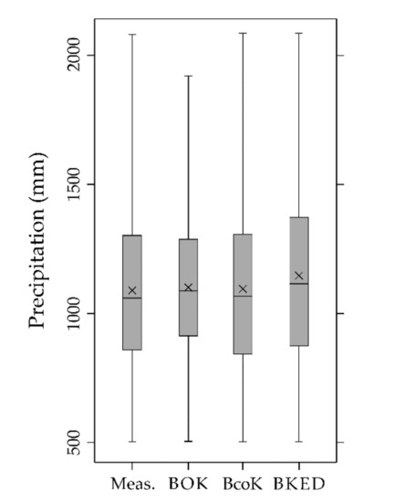 Box plots of the measured precipitation data (Meas.) and predicted precipitation using block ordinary kriging (BOK), block ordinary cokriging (BcoK), and block kriging with external drift (BKED).