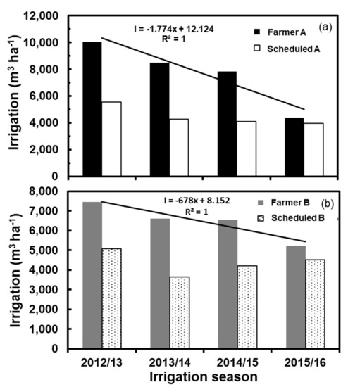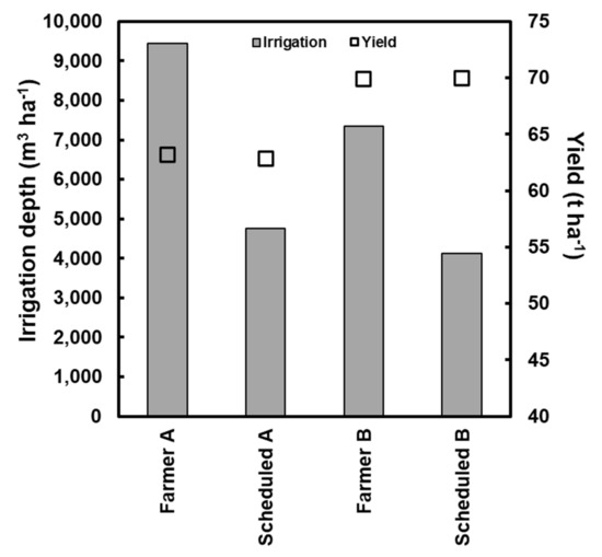 3.2. Farmer vs. Scheduled Irrigation Based on FAO Methodology