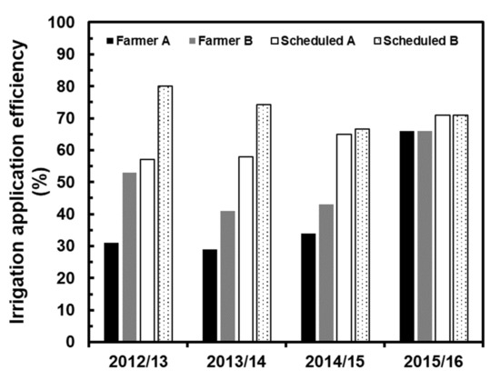 Irrigation application efficiency by Farmer A, Farmer B, and irrigation scheduled by IFAPA in both cases.