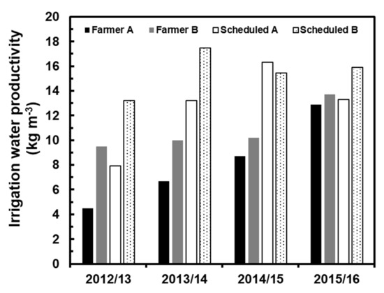 Irrigation water productivity by Farmer A, Farmer B, and irrigation scheduled by IFAPA in both cases.