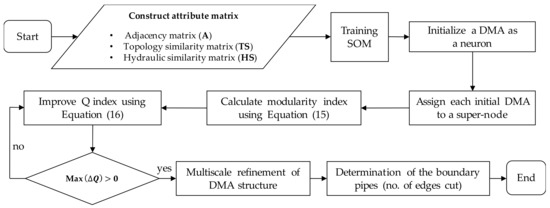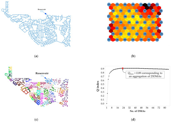 - Recently, an artificial neural network (ANN) approach, called self-organizing map (SOM) [47], was applied to a WDN clustering [7,48]. However, the related studies did not consider the hydraulic features and network topology of the generated DMAs.