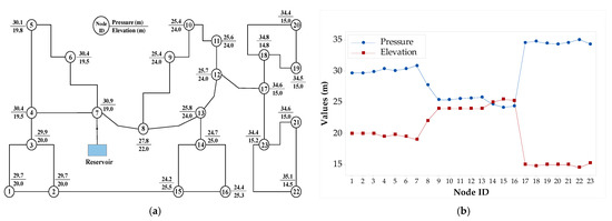Sample network illustration: (a) WDN layout and (b) variation in pressure and elevation at nodes.