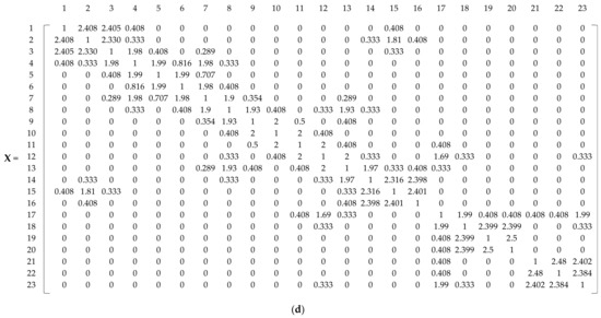 Construction of attribute matrices for the sample network. (a) Adjacency matrix (A) obtained from Equation (1); (b) TS matrix obtained from Equation (3); (c) HS matrix obtained from Equation (4); (d) Input matrix (X) for training the SOM obtained from Equation (7).