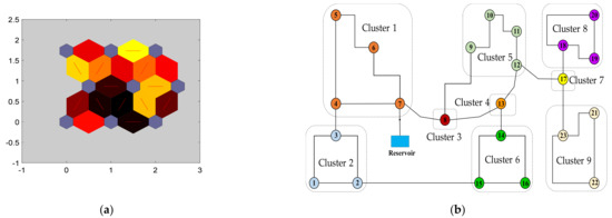 The neurons of SOM (i.e., output layers) are generally arranged in a typical two-dimensional structure. Higher-dimensional output layers are also possible but are generally not encouraged because it is difficult to visualize layers with more than three dimensions. In the SOM architecture, each neuron is a black box where a mathematical operation is executed during the training time and reveals the topological structure of the input space. The SOM size has a significant effect on the degree of stratification of the input space. A small SOM size may aggregate much of the input’s spatial structure, whereas a large size would result in many different strata. Hence, in this study, the output layer’s size was determined by a self-adaptive approach based on the scale of variation of pattern values at the nodes in Equation (8) to ensure that the maximum possible number of clusters is formed from the input data. Figure 2b illustrates the utilization of a trained SOM for a hypothetical WDN with a map size of .