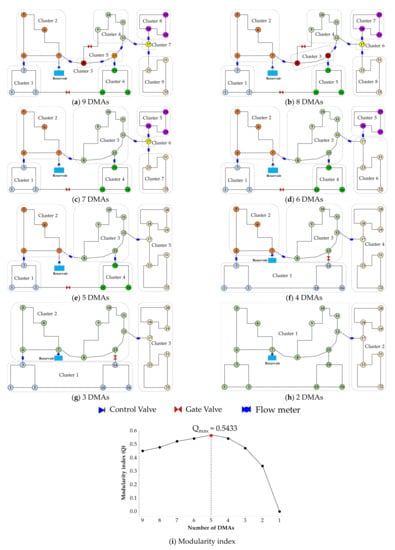 The CSA qualifies the communities in a network based on the modularity index (); thus, the possible number of DMAs is determined using . As a rule of thumb, a DMA layout is acceptable if the index is greater than 0.3 [55]. Figure 7a–h illustrates the change in the DMA layout configuration by implementing the CSA, and Figure 7i shows the variation in depending on the number of DMAs.