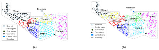 Figure 9 shows the change in typical network configurations of the 6, 7, 9, and 12 DMAs. Starting from the six DMA layouts (see Figure 9a) as the initial state, we can progressively see the decomposition. Figure 9b, DMA1 and DMA2 are decomposed from DMA1 in the six DMA layouts, forming a new layout with seven DMAs. The seven DMA design is further decomposed into a nine DMA design by sectorizing DMA5 and DMA7 into two smaller groups (Figure 9c); this DMA design is further decomposed, to finally reach the twelve DMA layout as seen in Figure 9d. In this way, the new DMA layouts that are created by top-down decomposing or bottom-up merging of DMAs always preserve the former layouts (i.e., boundary pipes).