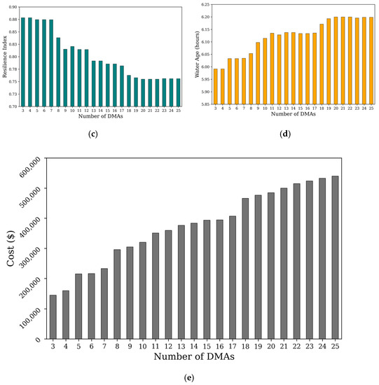 A set of 23 selected DMA layouts (from 3 DMAs to 25 DMAs) were comprehensively evaluated based on their performance. As mentioned in Section 2.5, five criteria were evaluated: (1) demand similarity, (2) pressure similarity, (3) system resilience, (4) WA, and (5) investment cost. The performances of WNP on various criteria are shown in Figure 10.
