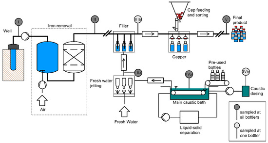 Schematic representation of water bottling and sampling locations: (I) raw water, (II) deferrized filtered water, (IIIa) cleaned glass bottles, (IIIb) filled glass bottles, (IVa) caustic cleaning solution, (IVb) caustic concentrate, (V) filled and capped glass bottles.