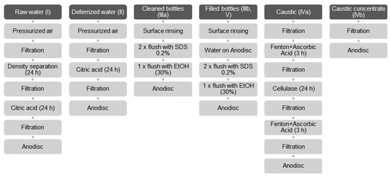 These possible entry paths along the filling process have not been addressed so far. To the best of our knowledge, this study is the first to take a closer look at the process of mineral water bottling and potential entry paths for MP at four German mineral water bottlers. The process of mineral water bottling was essentially the same at all bottlers and is briefly described in the following.