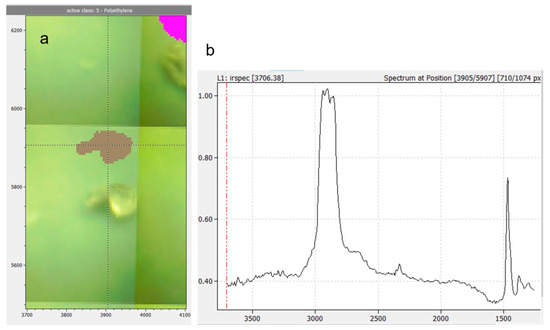 Shifted overlay of false color image and photograph of a PE particle (grey) and a PET particle (pink) (a). Axes in µm. Crosshairs indicate position of spectrum shown in (b): FTIR spectrum of the PE particle, absorption mode. Horizontal axis in wavenumbers, vertical axis dimensionless intensity counts.