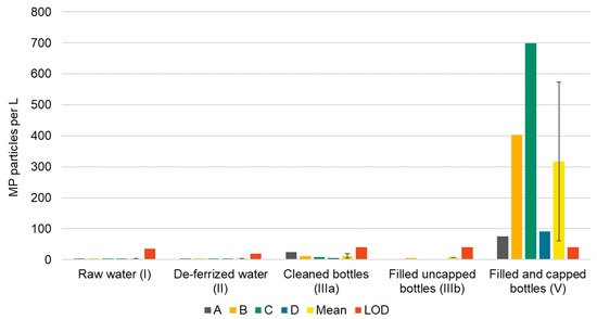 MP concentrations per L mineral water along the bottling process of four bottling sites (A–D), corresponding mean (error bars indicate standard deviation) and LODs for each sample type.