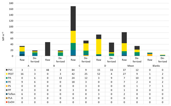 In raw water, PVC was the most abundant polymer type making up on average 46% of MP, followed by PEST with 34%. However, the polymer classes were distributed differently in all samples. In raw water from bottler B, 100% PVC was found. Dominating polymer types in deferrized waters were PVC (35%), PA (29%), and PEST (26%). PS and PE can be neglected in this analysis as they were found in the blanks in similar numbers as in the samples. In filled and capped bottles, the most abundant polymer class was PE (51−96%), followed by PS (1−29%). In Figure 5 and Figure 6, the polymer types per sample are shown in particles per m3 resp. per L.