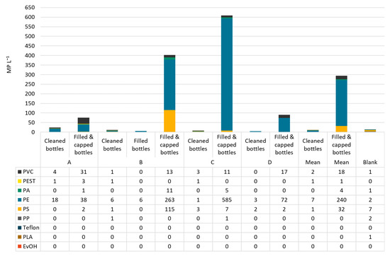 MP types and concentrations in cleaned, filled (B only) and filled and capped bottles from bottlers A–D.
