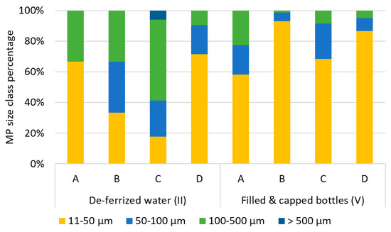 Summarizing these findings, a significant rise of MP concentrations was observed in filled and capped bottles (V, Figure 4), which suggests that MP entered the bottles during filling, capping or both. To prove this, three filled uncapped bottles (IIIb) were sampled at bottler B. With 6 MP L−1, these bottles were found to be free of MP.