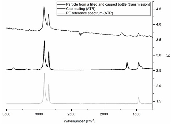 All three studies found PE to be among the prevailing polymer types (see Table 3). A recent work drew attention to false positive findings stemming from disposable gloves [36]. We did not use gloves when handling bottle samples and can therefore exclude this source of contamination. Our examination shows that MP contamination is <1 MP L−1 until bottle capping. It is known that opening and closing of water bottles leads to abrasion from the bottlenecks and caps [10,37]. ATR-FTIR measurements of the cap sealings revealed that they were made from a PE-like material (see Figure 8), thus, we suspect that the PE particles detected were generated when opening the bottles. All bottlers used a cap sealing material specified as “PVC-free soft polyolefin”. Different variants of this material are on the market. Remarkably, the caps of the bottles with the highest MP concentrations (B, C) both had sealings made from the same variant. Besides the material, capping parameters (contact pressure, drawing depth) may play a role, as well.