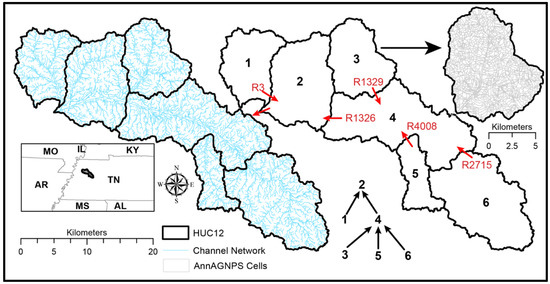 Watershed selected for evaluation of the AnnAGNPS ITEAMS simulation alternative. The watershed (HUC10) is composed of six sub-watersheds (HUC12s). The six sub-watersheds were discretized into 12,581 AnnAGNPS cells. Red arrows indicate selected AnnAGNPS reaches that link flow between HUC12s.