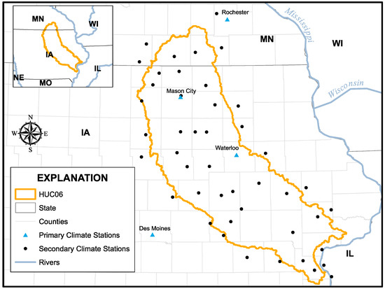 Daily observed and synthetic weather parameters for the time period between 1 January 2006 and 31 December 2018 were used. Observed climate measurements were gathered from the U.S. National Oceanic and Atmospheric Administration (NOAA)—Global Historical Climatology Network Daily [38] within and around the selected basin (Figure 3). A total of 45 weather stations were selected (black circles in Figure 3), quality controlled, and defined as secondary climate stations within the AnnAGNPS modeling schema. These weather stations were assigned to individual AnnAGNPS cells based on GIS zonal analysis of the AnnAGNPS cell layer and the weather station Voronoi diagram layer. These stations provided daily temperature (min and max) and precipitation. Four additional stations were selected because they provided the long-term statistical parameters (blue triangles in Figure 3) needed to generate synthetic estimates of minimum and maximum temperatures, precipitation, dew point, sky cover, wind speed, and solar radiation using the Generation of weather Elements for Multiple applications (GEM) model. The GEM climate model utilizes local historical climate data and long-term statistical parameters to produce continuous synthetic daily climate data [39]. Synthetic estimates of temperature and precipitation were replaced with observed ones based on spatial proximity. These four sites were designated as primary weather stations because they contained continuous datasets (no gaps). Primary weather stations were assigned to sub-watersheds (HUC12s) using GIS zonal analysis of the HUC12 boundaries and the primary weather station Voronoi diagram layer. During individual AnnAGNPS simulations, weather input parameters were read from the secondary weather station by default, and in case of missing values, were then read from the primary weather station. This allowed for a continuous weather input parameter while, at the same time, accounting for spatial/temporal variations captured by the large number of observation stations.