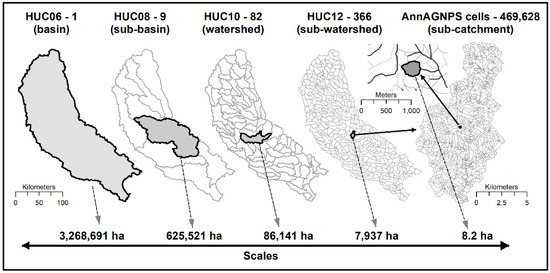 Illustration of the multiscale analysis from sub-catchments (AnnAGNPS cells) representing field-scale conditions to sub-basin (HUC08) scale representing regional conditions.