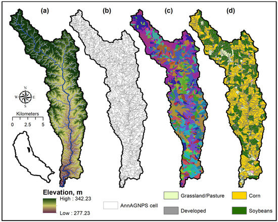 Crop type and land use/land cover information was gathered from the CDL raster grid files at 30 m spatial resolution [36]. Eleven GIS layers were downloaded representing individual years from 2008 to 2011. Similar to the soil assignment, a GIS zonal statistic operation was performed to assign the dominant crop type to each AnnAGNPS cell for each year considered (Figure 5d). The result of this analysis was a 11-year sequence of crop/land use type for each AnnAGNPS cell. The 11-year sequence of crop type in combination with typical farming practices representing one season were entered in custom scripts to generate 11-year crop rotations describing individual AnnAGNPS cells (Figure S2). Typical farming practices include management schedules as a temporal series of in-field operations. Each farm management schedule contains a continuous sequence of activities from all years considered in the simulation [27].