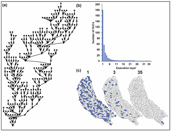 Graphical representation of the AnnAGNPS ITEAMS simulation execution sequence. Streamflow from one HUC12 to another determines the hierarchical execution sequence tree in which each dot represents an AnnAGNPS simulation at HUC12 scale (a). The execution tree is 35 layers deep indicating 35 sets of concurrent AnnAGNPS simulations (b). Lower execution layers are located throughout the basin while higher execution layers are located towards the main basin’s outlet (c).