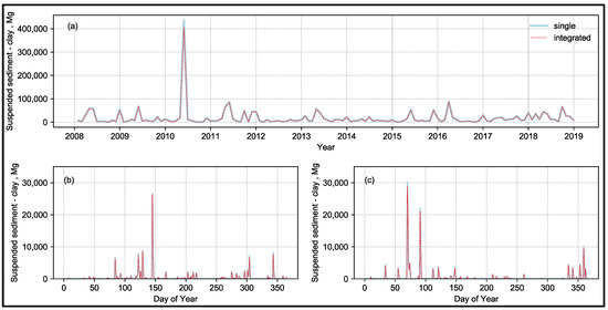 Daily analysis between 2008 and 2018 of simulated runoff and suspended sediment (clay and silt) loads were carried out using standard statistical metrics of Pearson’s correlation coefficient, Nash–Sutcliffe, percent bias, and RMSE-observations standard deviation ratio (RSR) [41]. Minimal differences in runoff between the two simulation methods were observed. Based on threshold metrics proposed by Moriasi et al. [42], all metrics were within the very good category at daily time scale (Table 1). Differences between these methods were mainly in suspended sediment loads represented by PBIAS values for clay and silt particle sizes (Table 1).