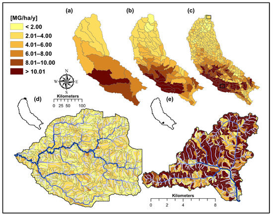 Example of aggregation of annual average total suspended sediment yield per unit of area converted to sub-basin—HUC08 (a), watershed—HUC10 (b), and sub-watershed—HUC12 (c) from field scale—AnnAGNPS cells (d,e).